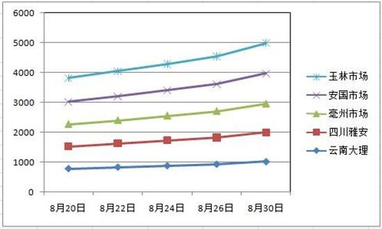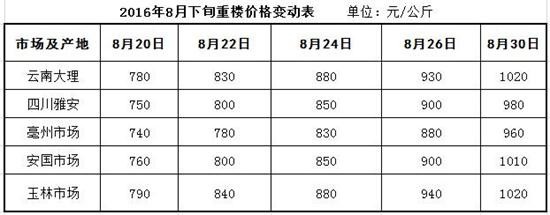 2016年7月25日,鉴于重楼人工种植及野生资源供给量持续下降、家种难以支撑以及企业批量采购等影响,上周重楼已突破千元大关。随着重楼集中产新结束,重楼价格行情在8月下旬开始发动,从740元-790元(公斤价,下同)价位一路上行,到8 月30日已经达到960元-1020元高位,涨幅高达30%以上!
